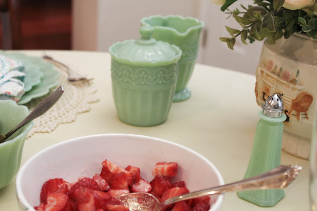 In the background you can see the Pioneer Woman's pretty little sugar bowl and creamer. That was for the coffee if they wanted some. You'll notice a pretty set of Jadeite salt and peppers but they aren't part of the Pioneer Woman's Jadeite. I found those in an antique shop but I don't think they are antique. Do I care? No, I do not and you want to know why? They. Are. Jadeite!