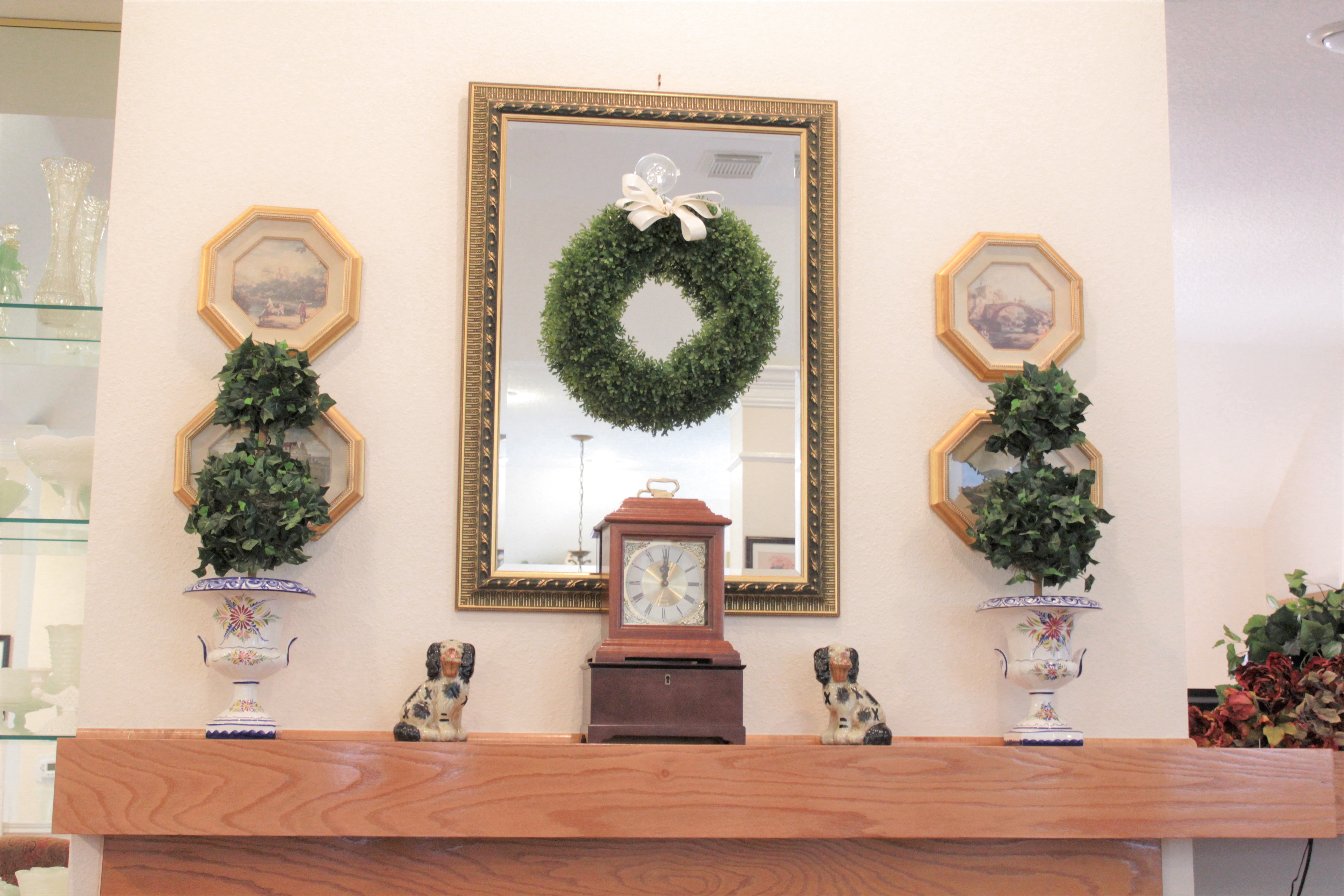 I poked a topiary on each side. I found these urns at Garden Ridge, now called At Home, probably over twenty years ago. I made the little faux greens to go around the topiary balls. I've used these so many times but still like them. I know they are sitting in front of my bottom pictures, it's okay.